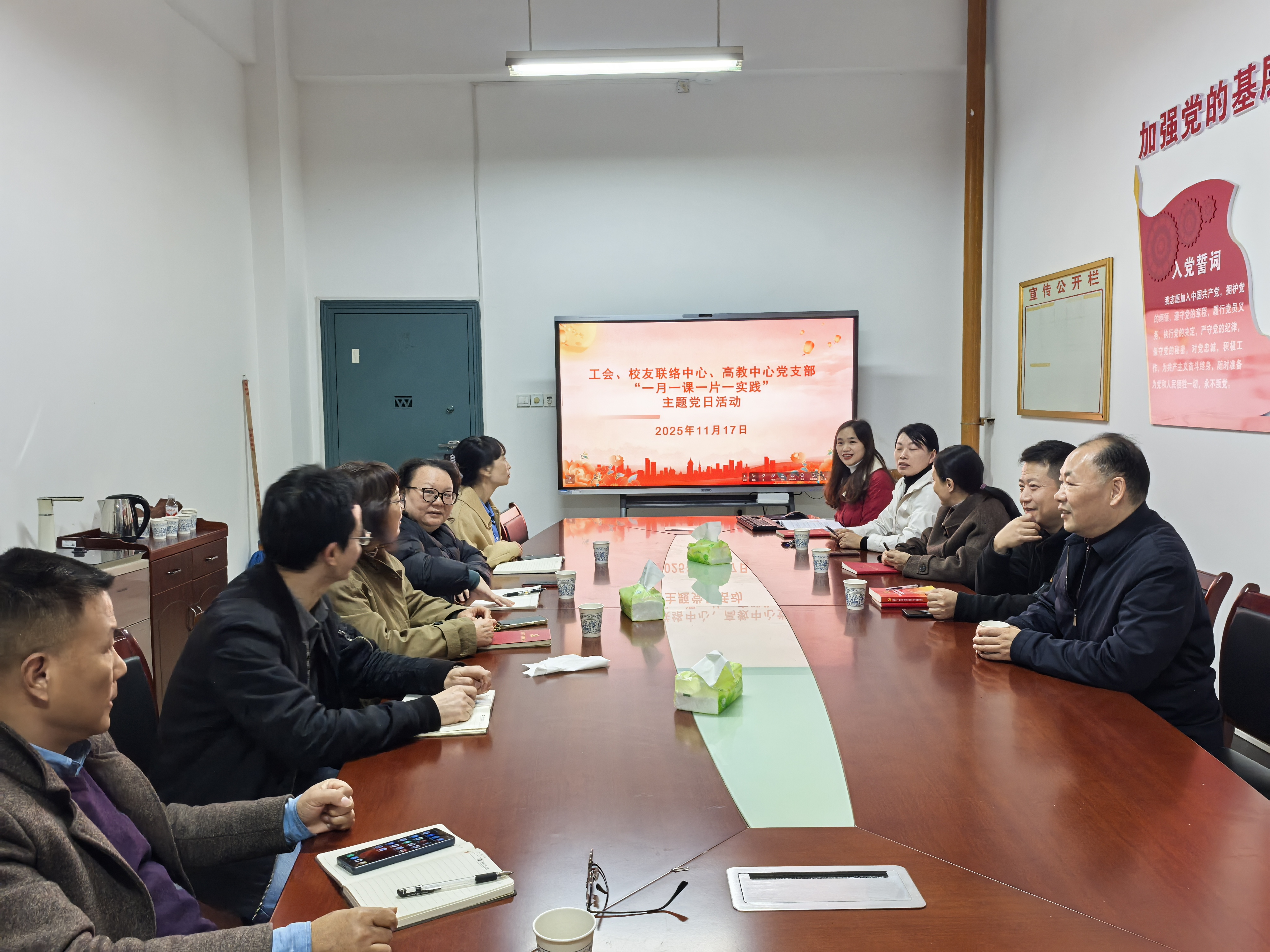 为深入学习贯彻党的二十届四中全会精神,切实将理论学习成果转化为工作实效,近日,2025年11月17日,工会、校友联络、高教中心党支部精心组织开展“一月一课一片一实践”主题党日活动。